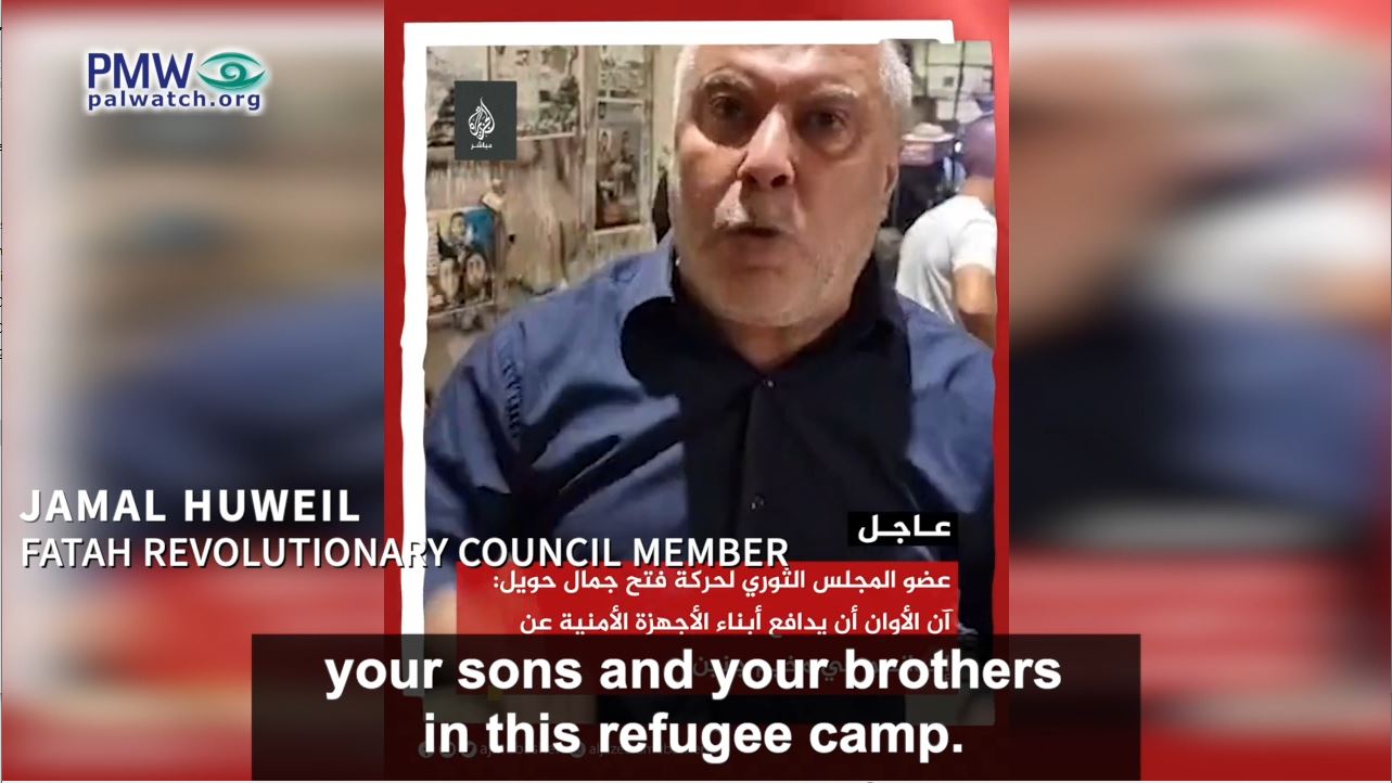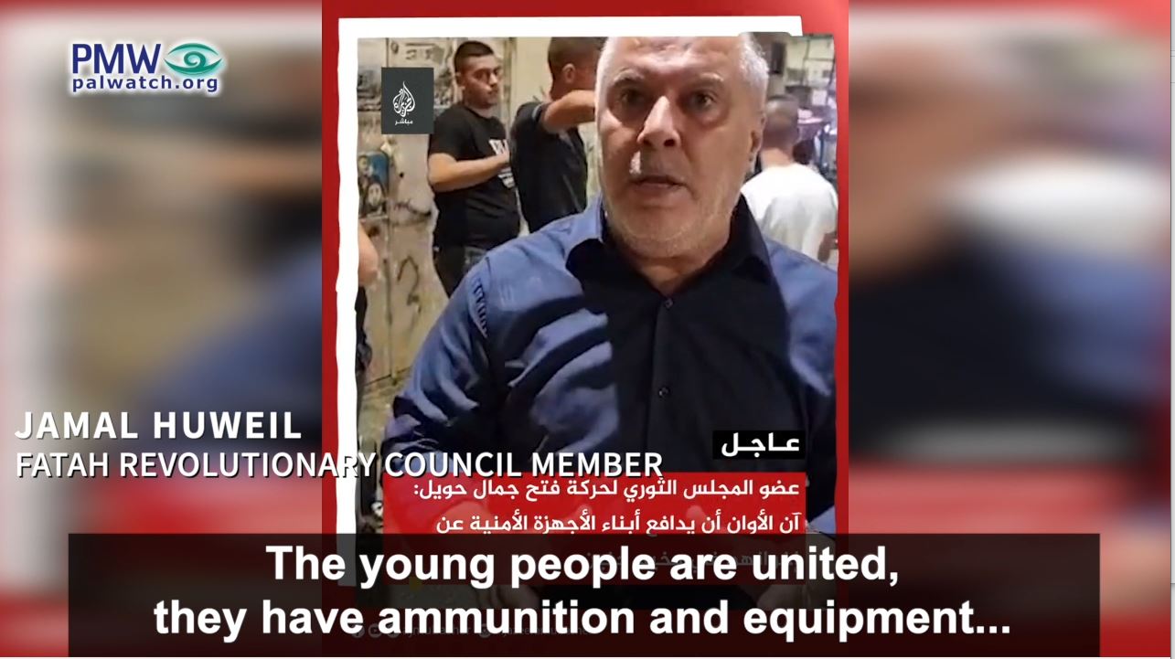 Fatah Revolutionary Council member Jamal Huweil: “The morale is sky-high, as if we were in the 2002 [Jenin] battle. There are heroes who do not fear death at all... The young people are united, they have ammunition and equipment… This is a message to all our heroes in Palestine: The Jenin refugee camp is fighting for the honor of Jerusalem, for the Gaza Strip… The fate of this refugee camp is always to write history in letters of gold and blood... Our motto is that this occupation will pay the price if it enters our alleys, neighborhoods, and homes, the criminal Zionist occupation. This is a message to all members of the Palestinian people, and a message to the free people, the members of the [PA] Security Forces: The time has come for you to defend your sons and your brothers in this refugee camp. This is a message to Hamas, Fatah, Islamic Jihad, and the PFLP, let them all turn into military wings to fight this occupation.”
