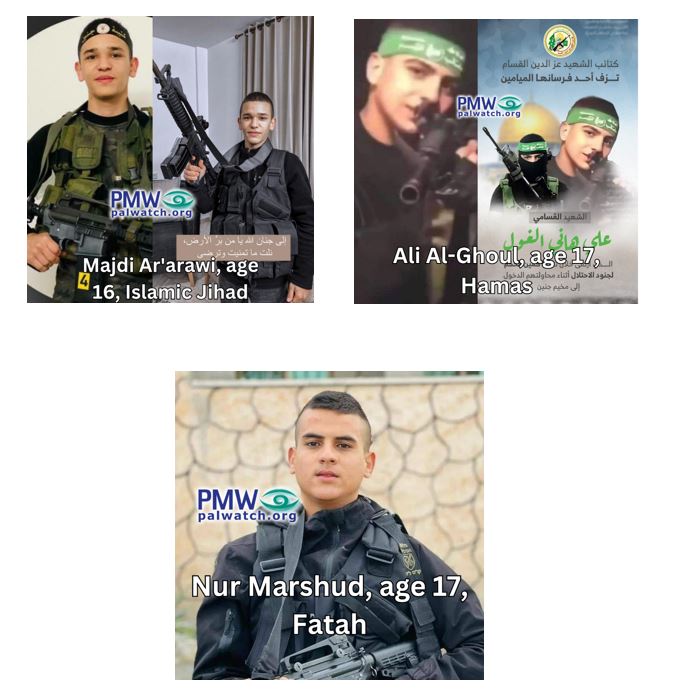 Majdi Ar’arawi, Ali Al-Ghoul, and Nour Al-Din Marshoud – Palestinian teen terrorists aged 16, 17, and 17 respectively who were killed during Israel’s Operation Home and Garden, a counter-terror operation in Jenin that started on July 3, 2023. Ar’arawi was a member of the Islamic Jihad terror organization, Al-Ghoul was a member of Hamas, while Marshoud was a member of the Al-Aqsa Martyrs’ Brigades (Fatah's military wing).