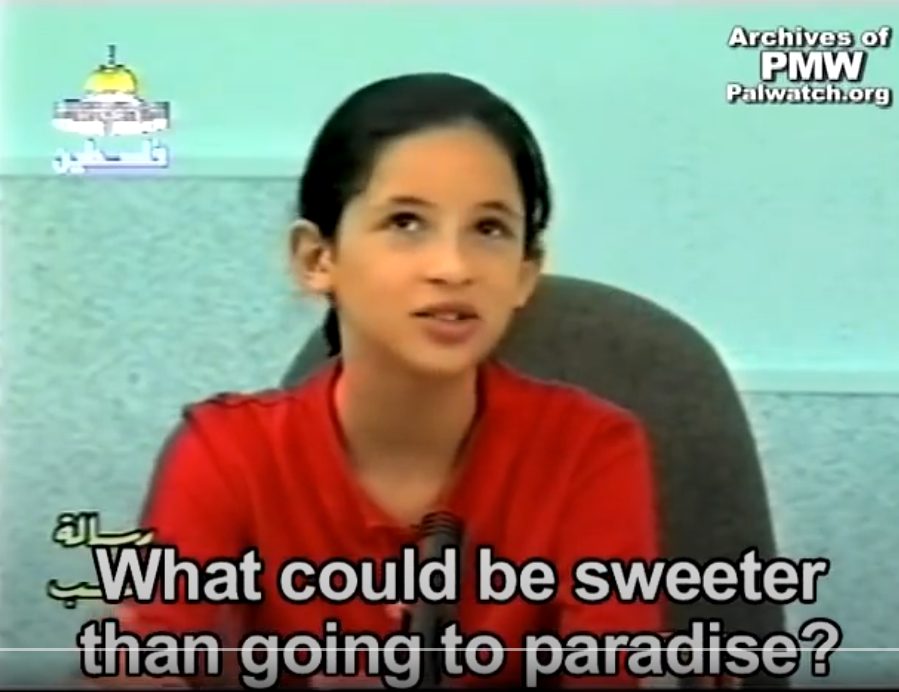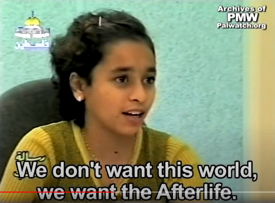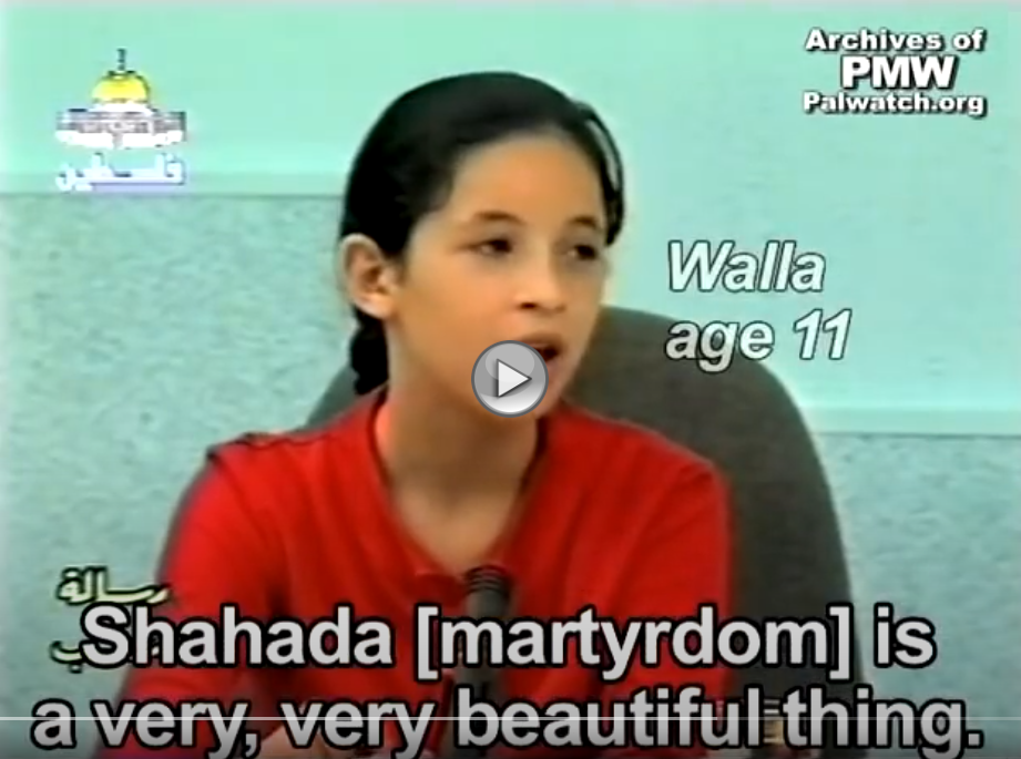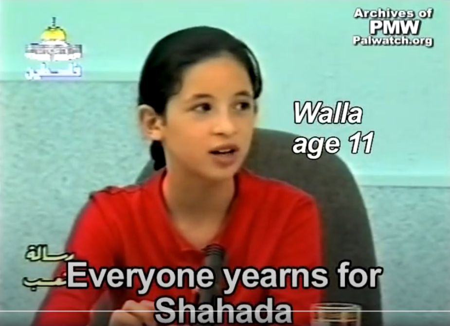 Theoretically, Walla and Yussra, who would be around 32 years old today, could be the mothers of Sadil and Jana. And whether Walla and Yussra achieved “Martyrdom-death” or lived to have children, their statements in 2002 represent an entire generation of Palestinian kids who were taught by the PA that death for Allah and “Palestine” is a cherished value and worth more than life. The PA never stopped teaching this. Sadil and Jana are the newest outcomes of the PA’s input: “1,000 times congratulations… on the Martyrdom.”