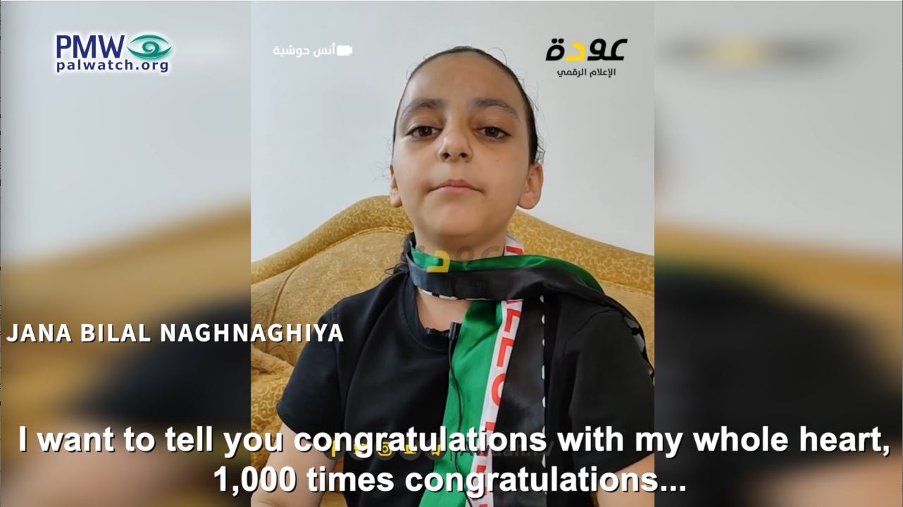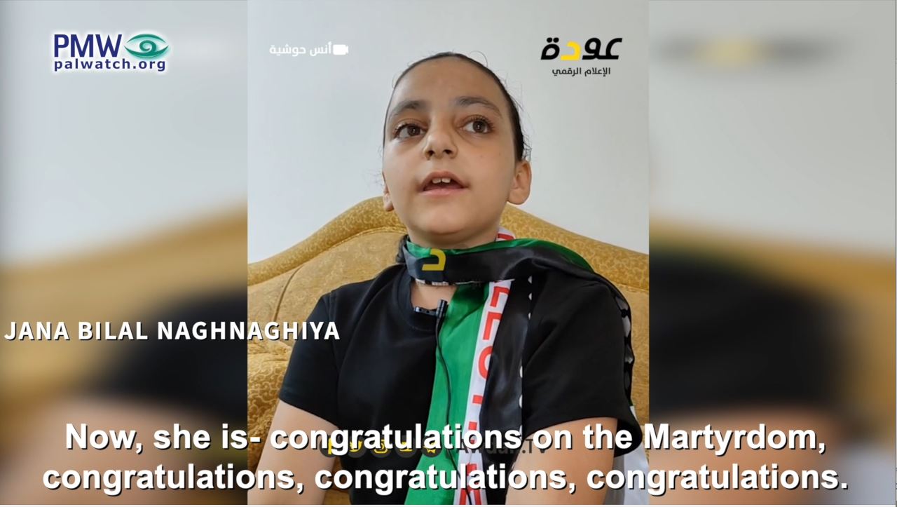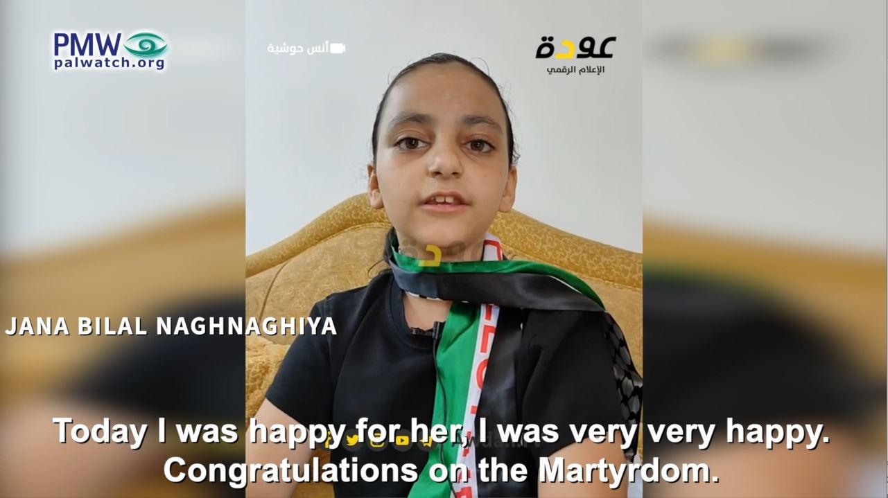 Two days later, her 8-year-old cousin Jana “congratulated her 1,000 times on her Martyrdom” on Fatah TV, and expressed how “happy” she is for her dead cousin: