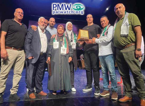 “The Ramallah Cultural Palace hosted the central ceremony of the Palestine Arm Wrestling Championship ‘Martyr Nasser Abu Hmeid Cup’ (i.e., terrorist, responsible for murder of 7). It was held under the auspices of Ramallah and El-Bireh District Governor Laila Ghannam, and in the presence of the mother of Martyr Nasser Abu Hmeid [Um Nasser Abu Hmeid] (i.e., mother of terrorists responsible for at least 10 murders; see note below) and Laila Ghannam.”