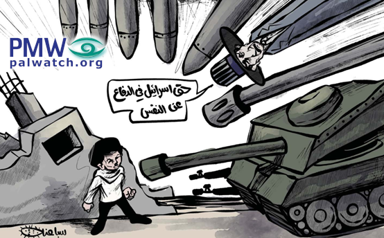 The cartoon shows a Palestinian boy wearing a keffiyeh (Arab headdress) standing in front of rubble. A tank is pointing its cannon at him, and another cannon and five missiles are also pointing at him, as is the head of Uncle Sam, who is presented as one of the weapons while saying: “Israel has the right to self-defense.”