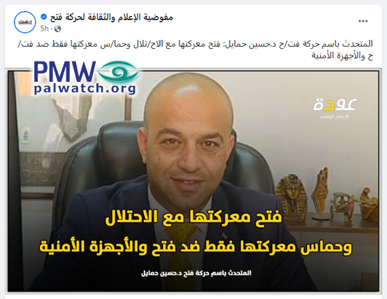 Posted text and text on image: “Fatah Movement Spokesperson Dr. Hussein Hamayel: Fatah’s battle is with the occupation, and Hamas’ battle is only against Fatah and the [PA] Security Forces.”
