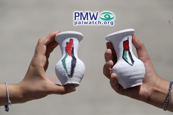 Inside the flowerpot are paper “flowers” with PA flags and names of Israeli cities misrepresented as “Palestinian cities”: “Lod, Haifa, Jaffa, Tiberias, Acre, Ashkelon, Beit Shean, Safed, Nazareth, Be’er Sheva the Negev, Ramallah, (i.e., all Israeli cities and regions except for Ramallah).”