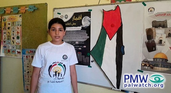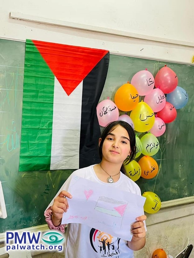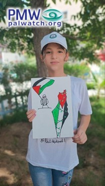 The picture shows a girl holding a decoration in the shape of the PA map of “Palestine.” On the table behind her is a box with “Returning” written on it, which has several round signs sticking out of it with the names of the following Israeli cities written on them: “Haifa, Tiberias, Nazareth, Ramle, Jaffa, Ashkelon, Safed, Acre, Lod.”