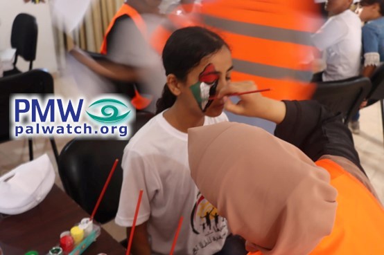 One summer camp even painted the PA map that erases Israel on Palestinian children's bodies. The top picture shows a Palestinian camp counselor in the summer camp painting a girl's face in the shape of the PA map of “Palestine” in the colors of the PA flag.