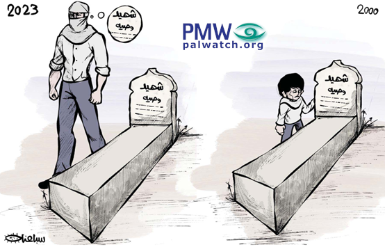 The cartoon is divided into two parts. On the right side, marked “2000,” a Palestinian boy is standing next to a grave, which has “Martyr, last will” written on its tombstone followed by the text of the will. On the left side, marked “2023,” a masked man – apparently the grown-up child from 2000 – is seen standing next to the same grave and thinking about the text on the tombstone. The cartoon apparently presents the masked man as being determined to carry out the “last will” of presumably his dead terrorist father to continue fighting against Israel.