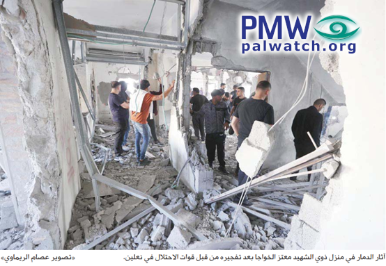 “The occupation forces blew up the family home of Martyr Mutaz Al-Khawaja (i.e., terrorist, murdered 1) in the town of Ni’lin northwest of Ramallah…