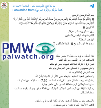 The Fatah Movement – Bethlehem Branch shared text on its Telegram channel from the Tulkarem Brigade Telegram channel