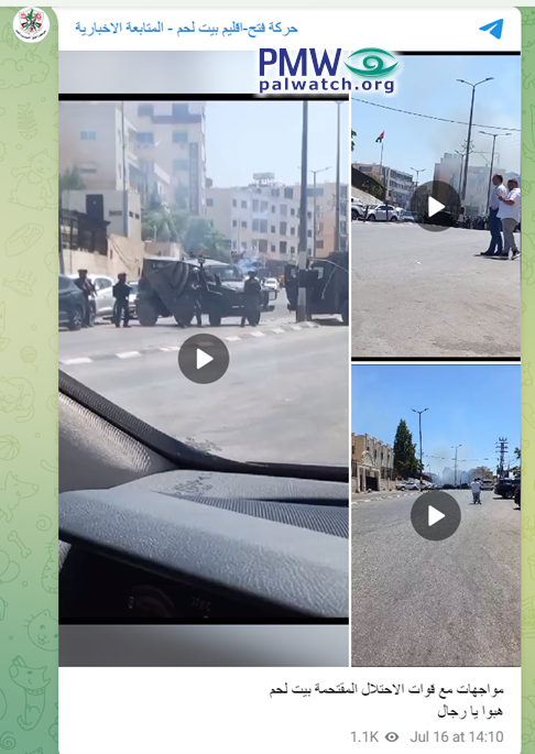 Posted text: “Confrontations with the occupation forces invading Bethlehem (refers to Israeli forces searching for fugitive terrorist Ammar Al-Najjar, who shot and wounded 3 -Ed.) –