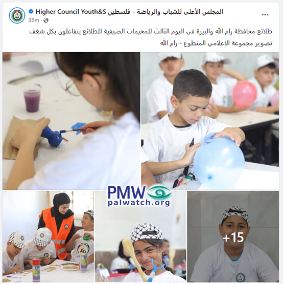 Posted text: “The children of the Ramallah and El-Bireh district participate with full vigor in the third day of the [PLO Supreme Council for Youth and Sports] summer camps”