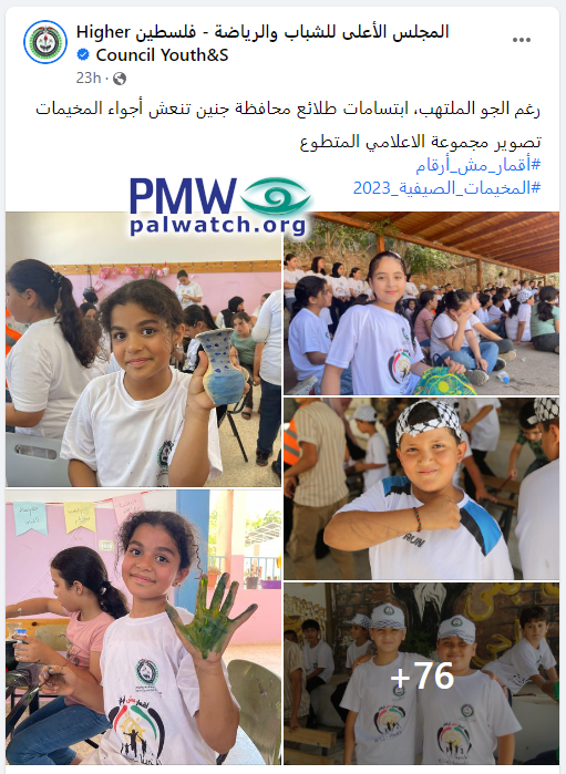 Posted text: “Despite the fierce heat, the smiles of the Jenin district children rejuvenate the atmosphere in the [PLO Supreme Council for Youth and Sports] summer camps”