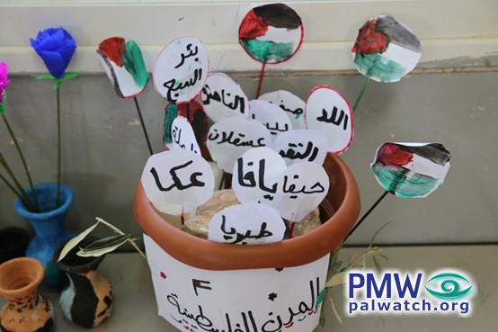 The image shows a flowerpot with “The Palestinian cities” written on it, and inside it are paper signs with Palestinian flags and the following text: “Lod, the Negev, Haifa, Jaffa, Tiberias, Acre, Ramallah, Ashkelon, Beit Shean, Safed, Nazareth, Be’er Sheva (i.e., all Israeli cities and regions except for Ramallah).”
