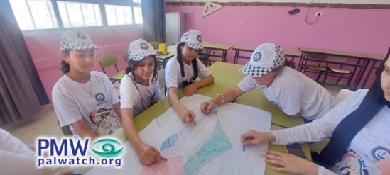 The images show children at the PLO Supreme Council for Youth and Sports summer camps drawing the PA map of “Palestine” that presents all of Israel together with the PA areas as “Palestine,” including PA maps in the colors of the Palestinian flag.