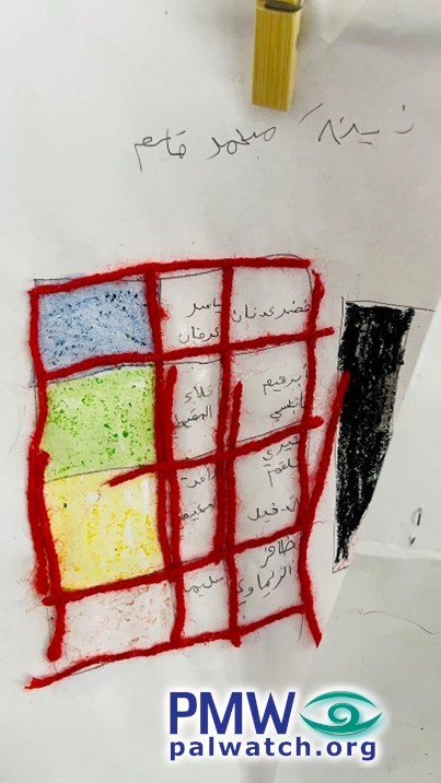 The photo below shows an art display at a summer camp featuring several pictures of terrorists. The picture to the left is of terrorist murderer Dalal Mughrabi. The others are of Uday Al-Tamimi, who murdered 1, and of Wadi’ Al-Houh, Abdallah Abu Al-Tin, and Ibrahim Al-Nabulsi, who all shot at Israeli soldiers. There are two signs on the left side, one of which reads “Jasmine neighborhood group,” while the other reads “Martyr Uday Al-Tamimi group.”