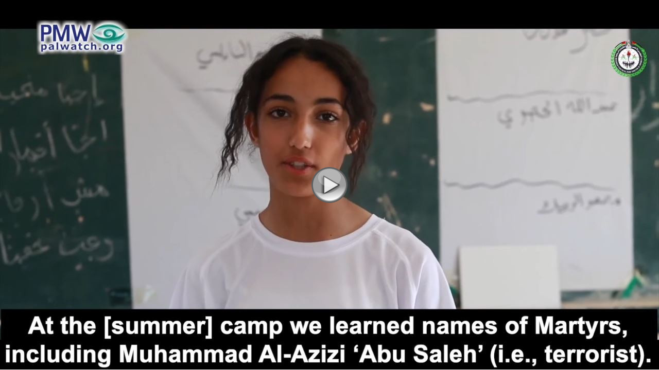 A central part of the PA summer camps seems to have been to teach the participating children about individual terrorists. In this video two girls explain that they were taught “the names of Martyrs” – i.e., dead terrorists: