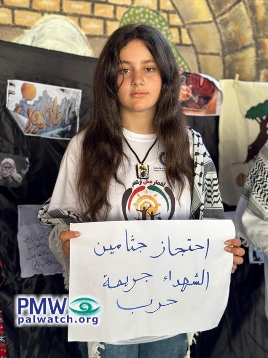 The children were also taught that Israel’s temporary burial of terroists who attacked Israelis is “a war crime”: