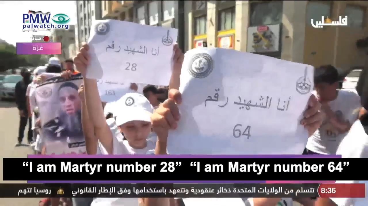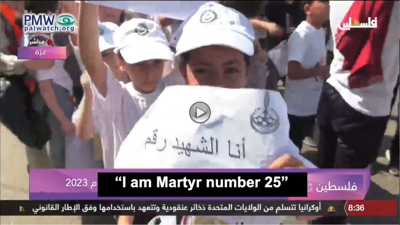 In the following video, children participating in PA summer camps in the Gaza Strip are taught to honor past terrorist “Martyrs” and to envision themselves as “Martyrs.” In a procession, children held signs that read: “I am Martyr number,” followed by a different number for each child. Moreover, the PA chose to name a sports event after a terrorist who was involved in the murder of 7 Israelis: