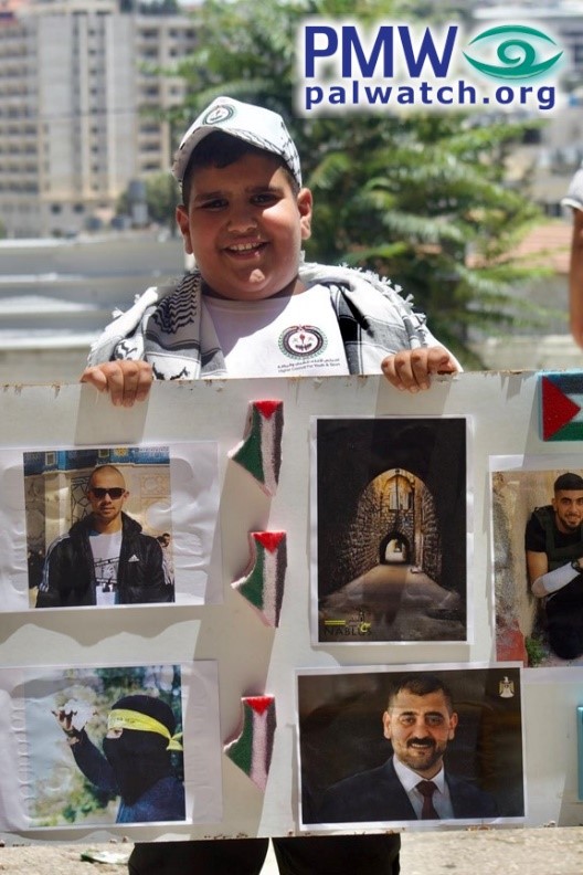 The following picture shows a child holding a sign bearing the text “Baha Al-Awawdeh,” a terrorist who wounded an Israeli soldier in a car ramming attack: