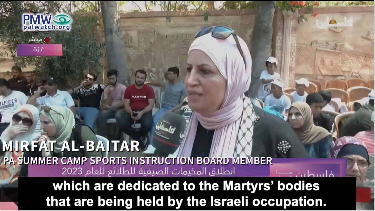 PA summer camp sports instruction board member Mirfat Al-Baitar: “We came to participate in launching the summer camps named ‘Moons and Not Numbers,’ which are dedicated to the Martyrs’ bodies that are being held by the Israeli occupation. For the sports event we picked the name of Nasser Abu Hmeid (i.e., terrorist, responsible for murder of 7), because he is the latest Martyr of medical neglect in the occupation’s prisons, and his body is still being held by the occupation.”