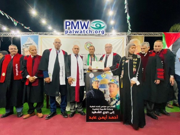 The pictures show the Al-Quds Open University graduation ceremony. A large picture of PA Chairman Mahmoud Abbas is seen in the stage backdrop, while in the foreground ceremony participants are standing on stage with posters of terrorists Ahmed Abed, who murdered 1 together with an accomplice, and Islamic Jihad terrorist Majdi Ar’arawi, who was killed during 2023 Operation Home and Garden.