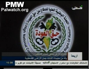 During a broadcast covering a ceremony about Palestinian refugees, PA TV focused on the following logo showing a map of Israel with two keys over it, symbolizing Palestinian ownership over the land. The words "Right of Return" are written over the map in red.