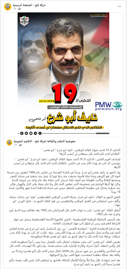 Posted text: “After the outbreak of the second Intifada (i.e., PA terror campaign 2000-2005, more than 1,100 Israelis murdered), the role of fighter Naif Abu Sharakh stood out in leading the resistance, which was expressed by establishing the Al-Aqsa Martyrs’ Brigades. The Al-Aqsa [Martyrs’] Brigades carried out high-quality operations (i.e., terror attacks) against the occupation, which turned Martyr Naif ‘Abu Fathi’ into a target in its eyes.”