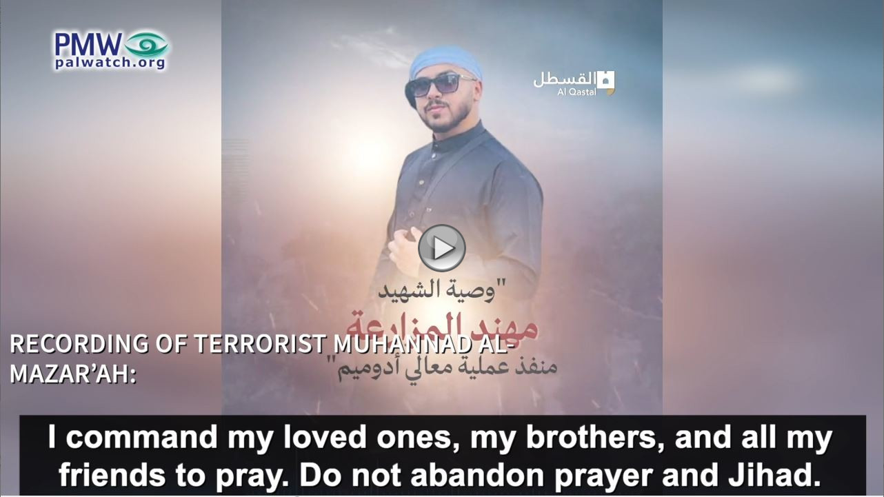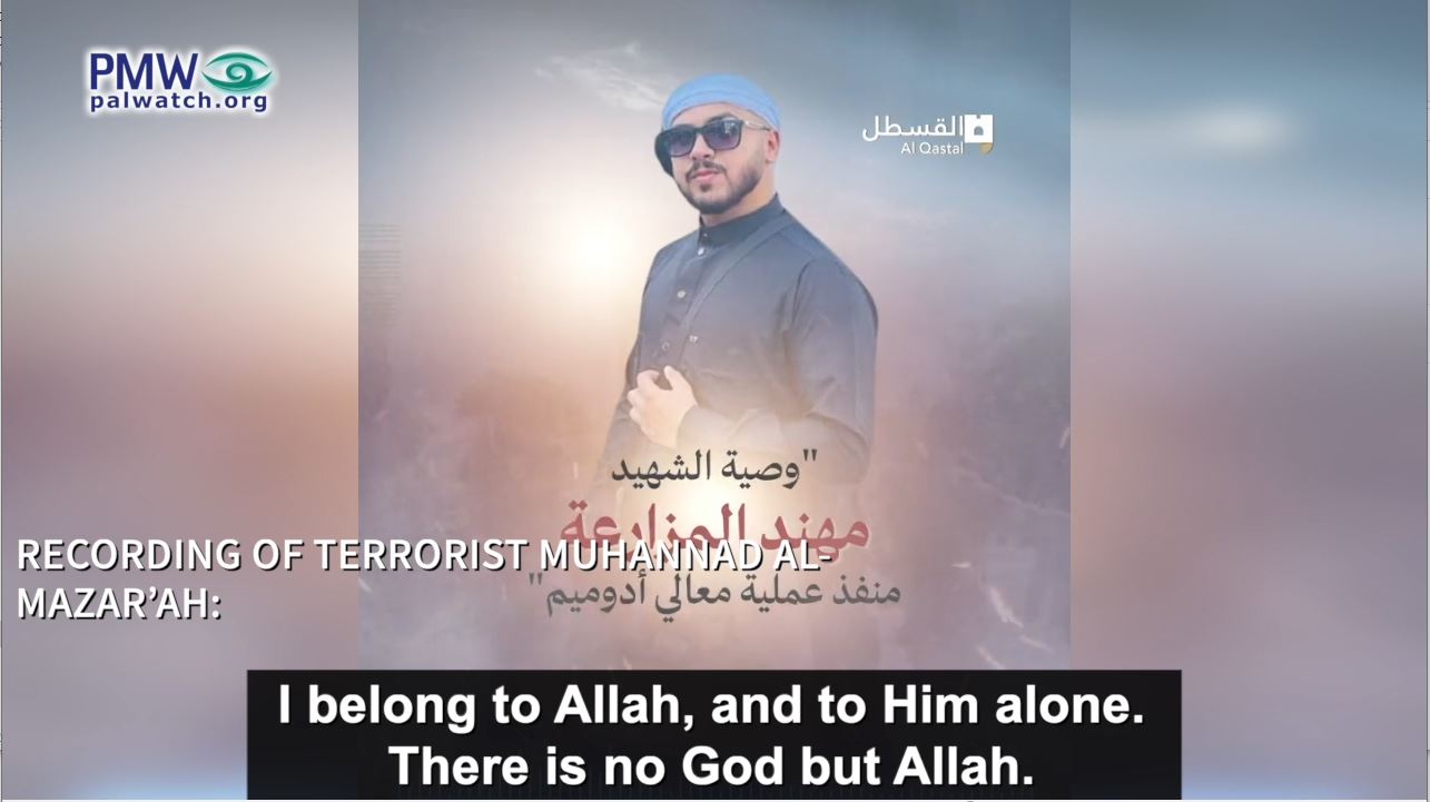 Recording of terrorist Muhannad Al-Mazar’ah: “Allah willing, we will show Allah good deeds. Allah willing, we will make Allah laugh from our deeds and be proud of our deeds… I command my loved ones, my brothers, and all my friends to pray. Do not abandon prayer and Jihad. We want to meet, Allah willing, in Paradise. O, Master of the Universe. Since Allah will honor me and I will die for Him and become a Martyr… Do not accompany my body to burial among any [of the political] factions. I belong to Allah, and to Him alone. There is no God but Allah.”