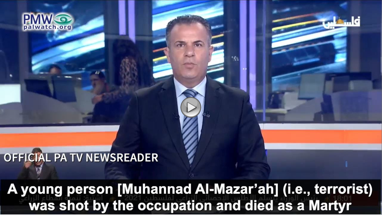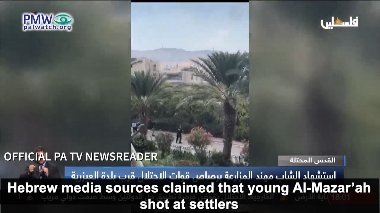 Official PA TV newsreader: “A young person [Muhannad Al-Mazar’ah] (i.e., terrorist) was shot by the occupation and died as a Martyr next to the town of Al-Eizariya, east of occupied Jerusalem... Hebrew media sources claimed that young Al-Mazar’ah shot at settlers at the entrance to the settlement of Ma’ale Adumim… and wounded some of them…