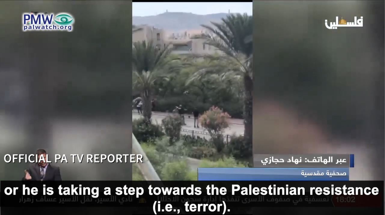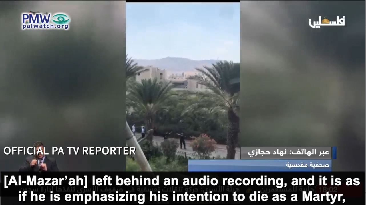 Official PA TV reporter: “[Al-Mazar’ah] left behind an audio recording, and it is as if he is emphasizing his intention to die as a Martyr, or he is taking a step towards the Palestinian resistance (i.e., terror).”