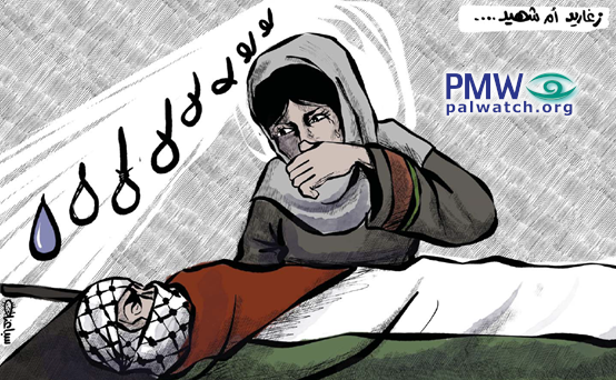Cartoon released by the Palestinian Authority depicts the mother of a “Martyr” shedding tears of happiness