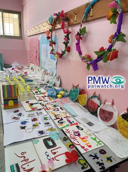 The picture shows a display of artwork made by children participating in the PLO Supreme Council for Youth and Sports summer camps. In the bottom are two pieces of paper with the names of the Israeli cities “Jaffa” and “Nazareth” written on them next to the Palestinian flag.