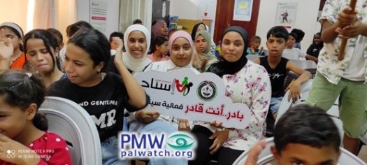 The picture shows children participating in the PLO Supreme Council for Youth and Sports summer camp activities. Several children are holding a sign featuring the logo of the PLO Supreme Council for Youth and Sports “Isnad” youth program. The logo includes the word “Isnad,” with the PA map of “Palestine” that presents all of Israel together with the PA areas as “Palestine” taking the place of the letter “I.”