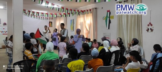 The picture shows children participating in the activities. Hanging on the wall in the background is a decoration in the shape of the PA map of “Palestine” in the colors of the Palestinian flag.