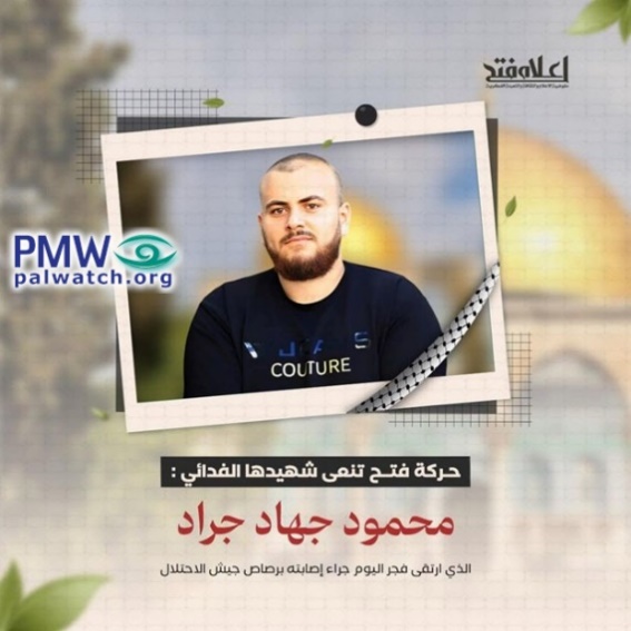 Text on image: “The Fatah Movement eulogizes its Martyr self-sacrificing fighter Mahmoud Jihad Al-Jarrad (i.e., terrorist, shot at Israeli soldiers), who ascended to Heaven at dawn today [Aug. 11, 2023] due to being shot and wounded by the occupation army”