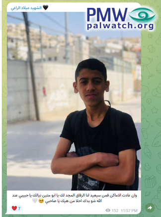 The “Milad Al-Ra’i” Telegram channel – which was created to commemorate dead terrorist Milad Al-Ra’i, who participated in violent confrontations with Israeli soldiers – posted a picture and text