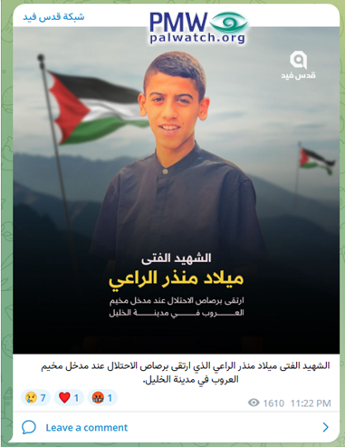 Posted text: “Young Martyr Milad Mundhir Al-Ra’i (i.e., terrorist, participated in violent confrontations with Israeli soldiers) – ascended [to Heaven as a Martyr] next to the entrance to the Al-Aroub [refugee] camp in Hebron.”