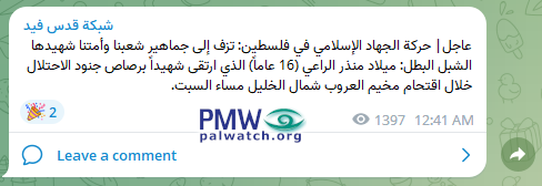 Posted text: “Urgent: The Palestinian Islamic Jihad Movementannounces a wedding celebration (i.e., a Martyr's funeral is considered his wedding to the 72 Virgins in Paradise in Islam) to the publics of our people and our nation for its young heroic Martyr: Milad Mundhir Al-Ra’i (i.e., terrorist, participated in violent confrontations with Israeli soldiers), 16, who was shot by the occupation soldiers and ascended [to Heaven] as a Martyr during an invasion of the Al-Aroub [refugee] camp north of Hebron yesterday, Saturday [Sept. 9, 2023].”