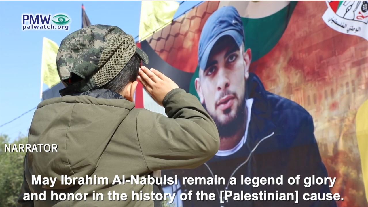 During the video, a small child is seen saluting the picture of terrorist Al-Nabulsi: