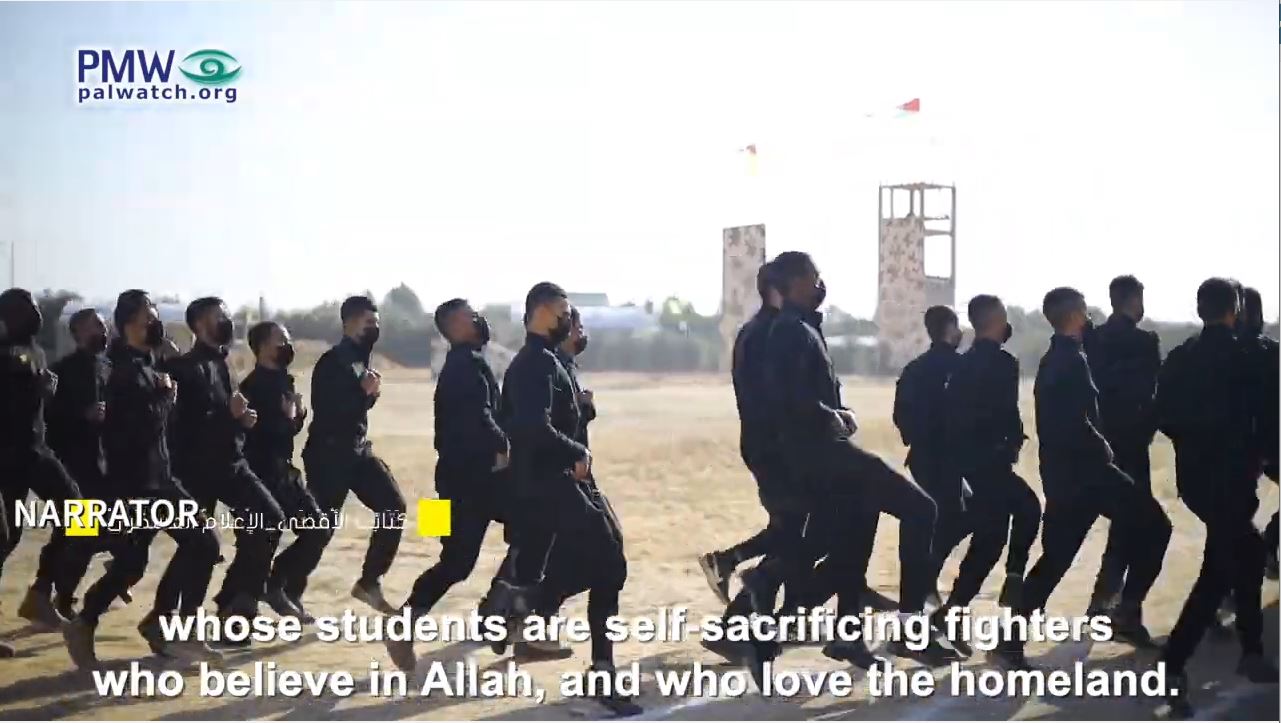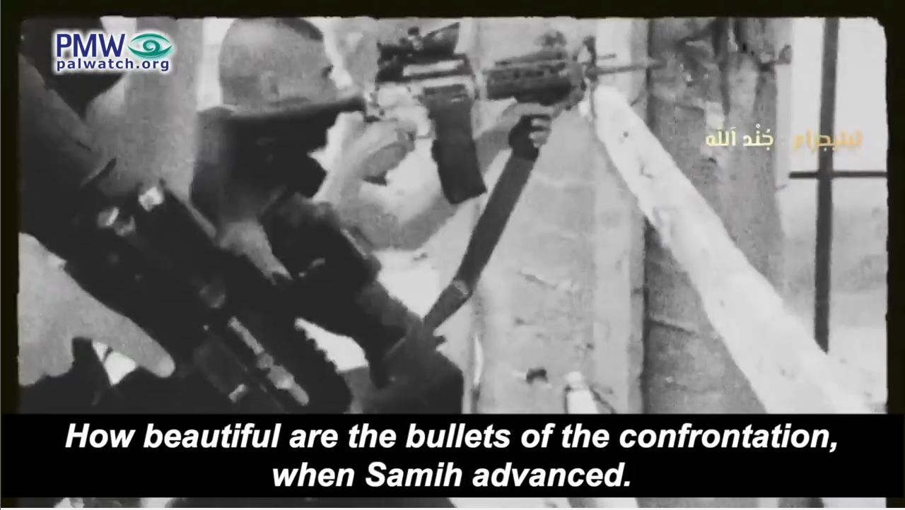 A narrator praises terrorist Al-Nabulsi as a “model of heroism” and as having left behind “an eternal revolutionary school, whose students are self-sacrificing fighters who believe in Allah.” For these Fatah soldiers, allegiance to the rifle is “sacred”: