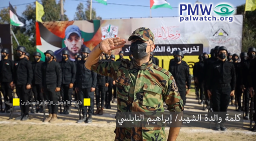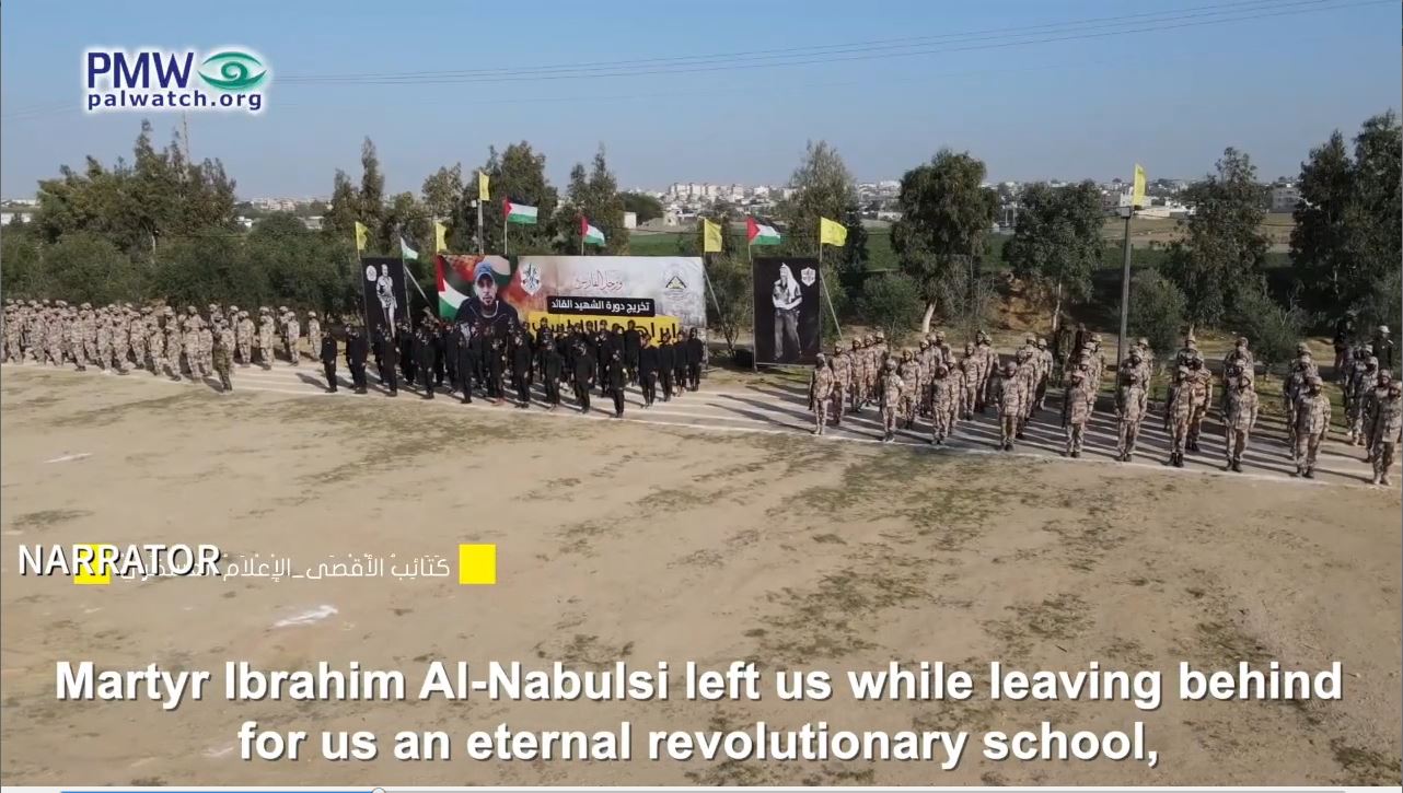 On the anniversary of the death of terrorist Ibrahim Al-Nabulsi – a member of the Al-Aqsa Martyrs’ Brigades (Fatah’s military wing) who was responsible for a series of shooting attacks – Abbas’ Fatah Movement published a video showing a ceremony from a military training course named after the terrorist, held by the Al-Aqsa Martyrs’ Brigades, Palestine – Martyr Nidal Al-Amoudi Brigade in the Gaza Strip.