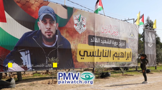 The stage backdrop of the ceremony had a huge picture of terrorist Ibrahim Al-Nabulsi and posters of former PA Chairman Yasser Arafat and arch-terrorist Khalil Al-Wazir “Abu Jihad,” who was responsible for the murder of 125. The logos of both Fatah and the Al-Aqsa Martyrs’ Brigades appeared on the ceremony poster.