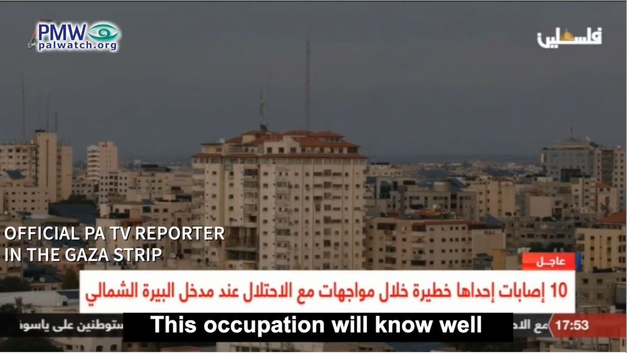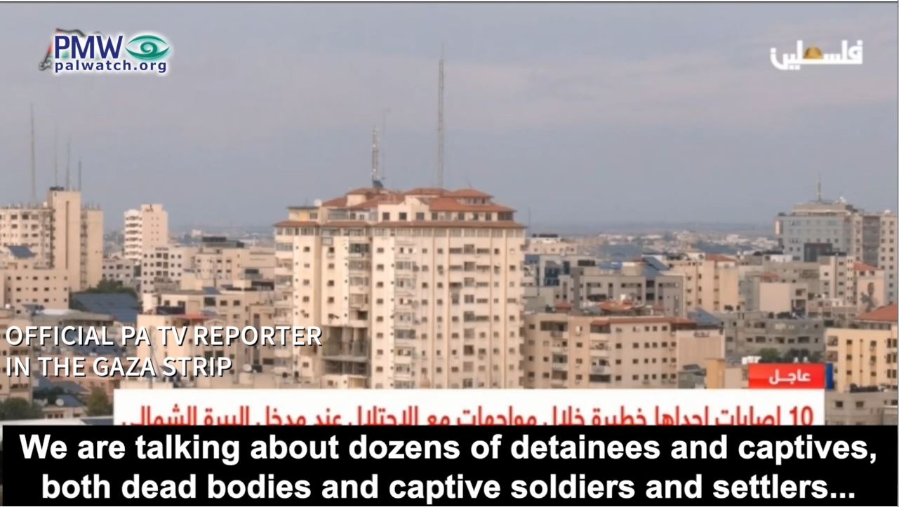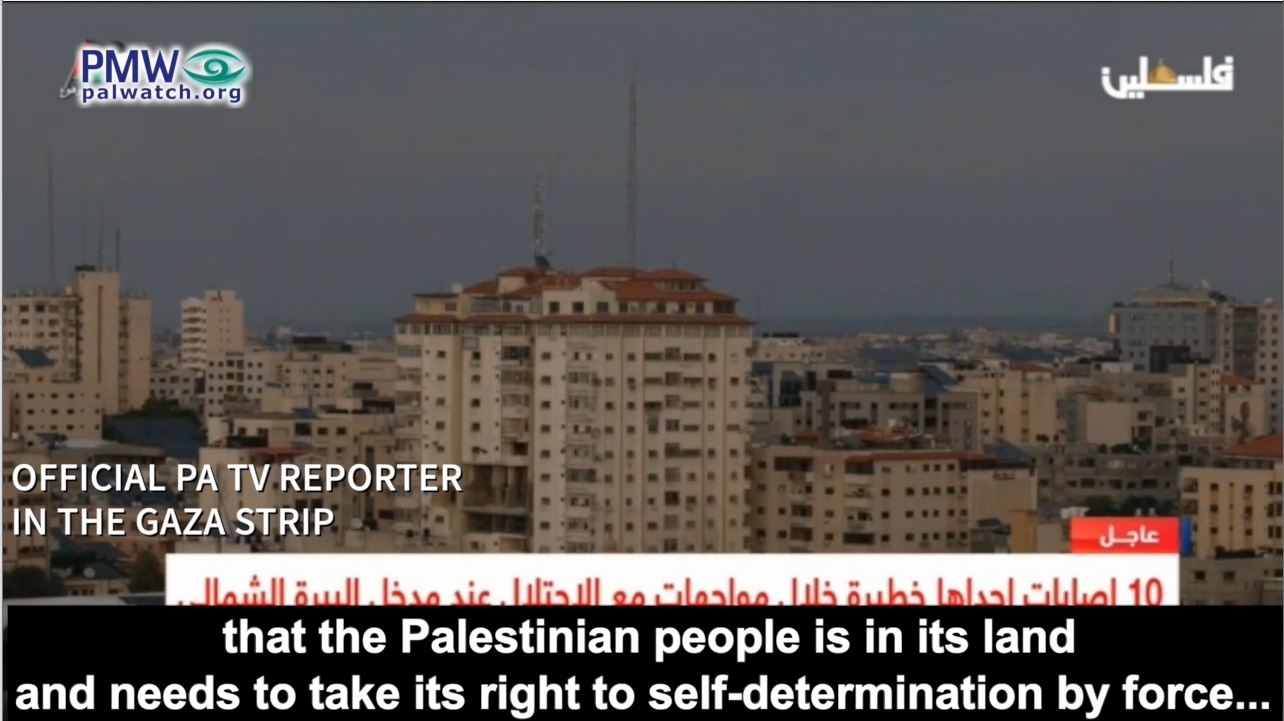 Official PA TV reporter in the Gaza Strip: “Today Gaza landed a blow that this occupation will yet remember… Today the Palestinian people had its say, and the Resistance (i.e., Hamas = Islamic Resistance Movement) responded with all the force at its disposal... Today Palestine stands united against the barbaric aggression that the Israeli occupation is committing… This operation (i.e., Hamas terror massacre) disrupted the Israeli calculations and history will mark it. This occupation (i.e., Israel) will know well that the Palestinian people is in its land and needs to take its right to self-determination by force... Today the world states are taking action to save this occupation from this military operation in which [Israel suffered] killed people and captives. We are talking about dozens of detainees and captives, both dead bodies and captive soldiers and settlers… Today they are imprisoned in the Gaza Strip.”