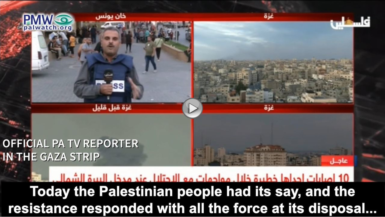 On Saturday, when Hamas launched its evil massacre on Israeli citizens, murdering, raping, and kidnapping civilians as well as mutilating their dead bodies, official PA TV broadcast the PA’s support for and celebration of the attack via its Gaza Strip reporter.