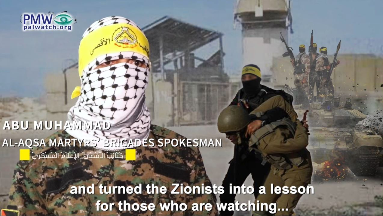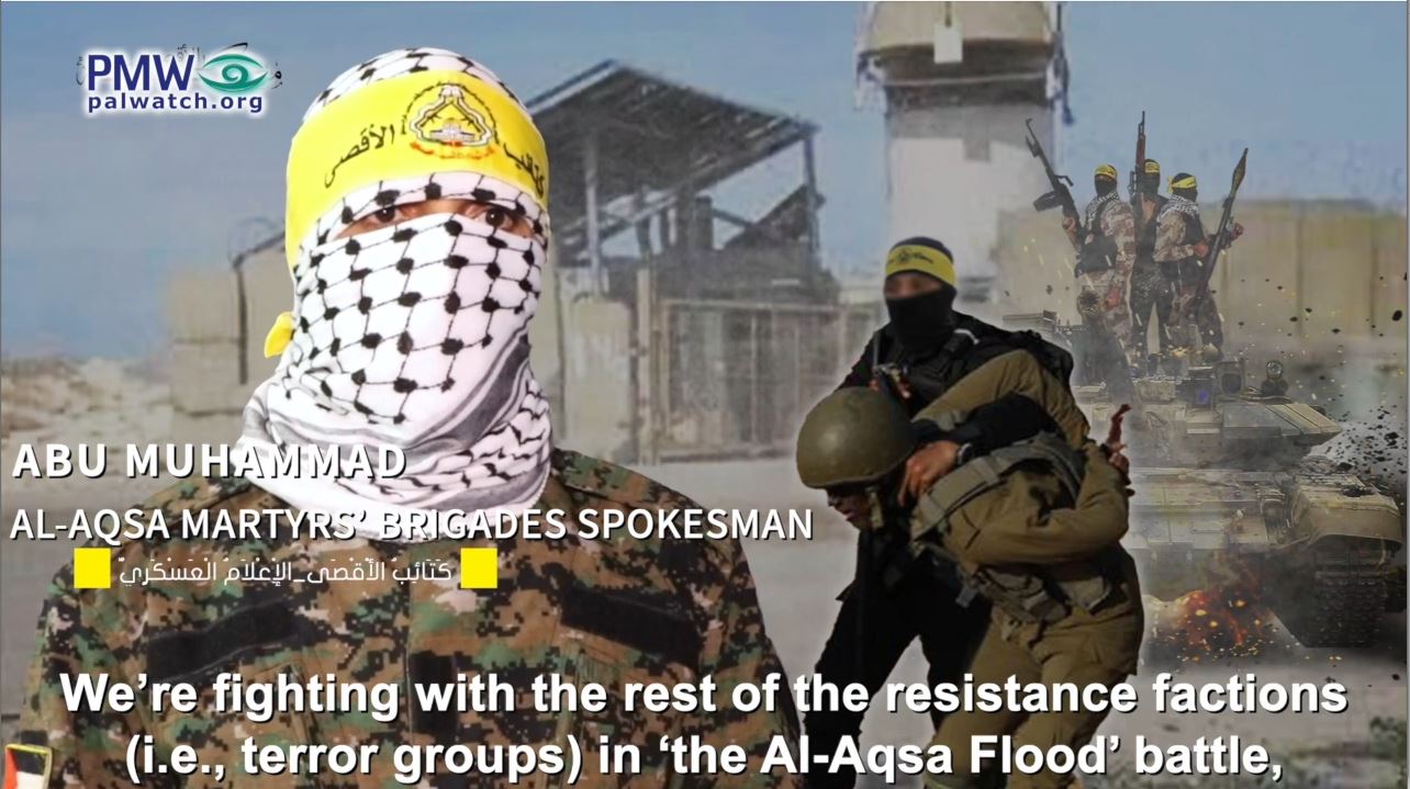 Al-Aqsa Martyrs’ Brigades Spokesman Abu Muhammad: “Praise Allah who strengthened and supported, humiliated and defeated, and turned the Zionists into a lesson for those who are watching… We’re fighting with the rest of the resistance factions (i.e., terror groups) in ‘the Al-Aqsa Flood’ battle, by the power of Allah and with His help… It has already become clear that the end of the thieving occupier’s imaginary entity (i.e., Israel) is near…The Al-Aqsa [Martyrs’] Brigades, together with the rest of the Palestinian resistance factions, carried out several operations (i.e., terror attacks) behind enemy lines as part of ‘the Al-Aqsa Flood’ battle, which constituted a crossroads in the history of our struggle with the occupier, and praise Allah, we killed and took captive occupation soldiers (sic. the majority were civilians) …Together with the rest of the Palestinian resistance factions, and as part of the joint operations room, we succeeded in moving from defense to attack. This emphasizes that there are new rules in the struggle, and the cowardly enemy will not be able – despite all the technology it has – to defeat our fighters… This battle is a new defeat for [Israeli Prime Minister] Netanyahu and his trembling army… We inflicted on them heavy losses and great humiliation that the enemy won’t be able to ignore. We emphasize to all our people that we will continue, together with the rest of the resistance factions, in this battle until the occupation’s aggression against the Al-Aqsa Mosque, Jerusalem, the Gaza Strip, the West Bank, our occupied lands, and everywhere in Palestine are stopped. This is a revolution until victory; the Al-Aqsa Martyrs’ Brigades – Palestine.”