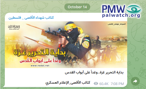 The Al-Aqsa Martyrs’ Brigades also posted this image and text glorifying Hamas’ attack, talking about the “liberation of the Gaza Strip” as a prelude to liberating the rest of “Palestine” through “the gates of Jerusalem”: