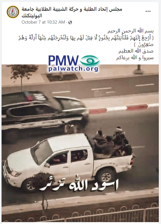 The Student Union Council and Fatah's Shabiba Student Movement at Palestine Polytechnic University posted pictures in support of the Hamas attack. Fatah students praised Hamas terrorists shooting at an Israeli police car in the Israeli city of Sderot during the launch of Hamas’ massacre with the text “Allah’s lions roar”: