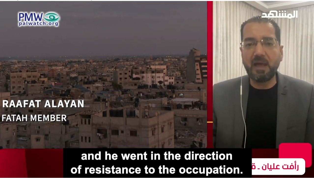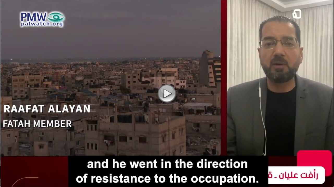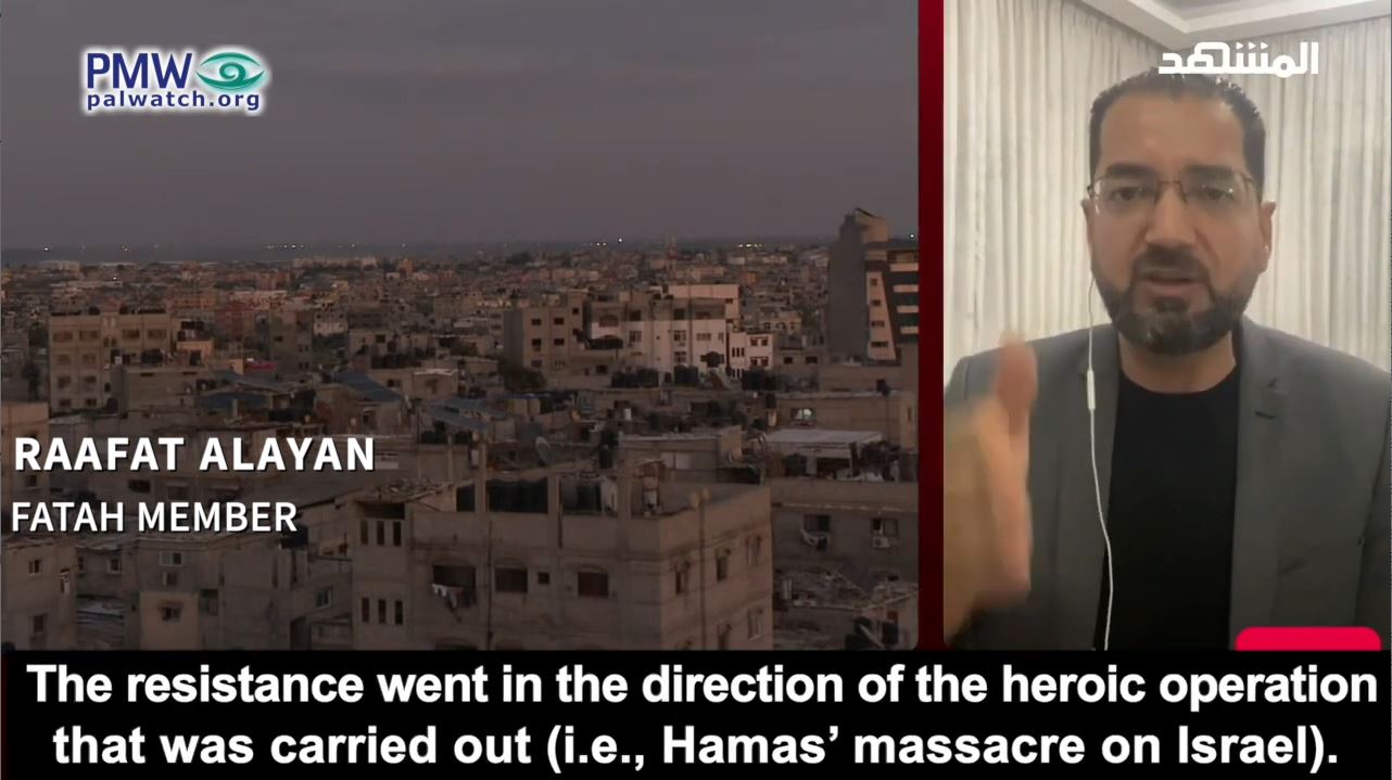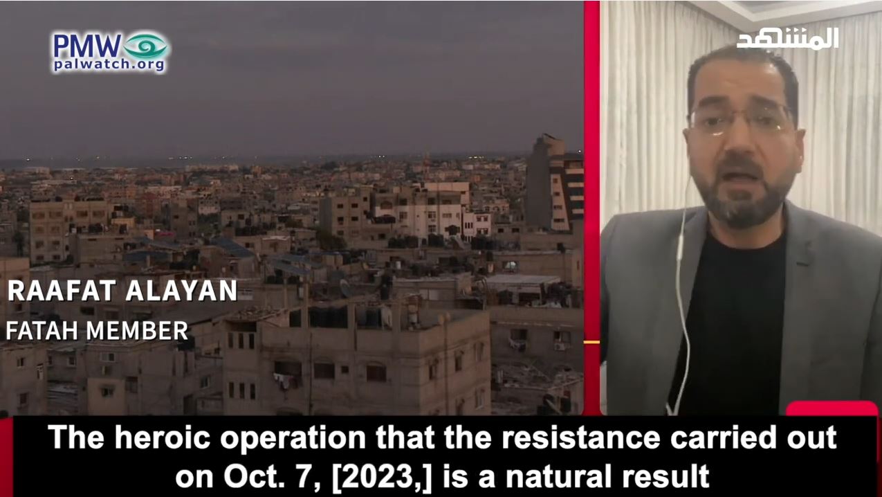 Fatah member Raafat Alayan: “The Palestinian was left without a choice…. He had no option other than the option of resistance, and he went in the direction of resistance to the occupation. The resistance went in the direction of the heroic operation that was carried out (i.e., Hamas’ massacre on Israel). The heroic operation that the resistance carried out on Oct. 7, [2023,] is a natural result of the bias of the international institutions in favor of the US that is biased in favor of Israel.”