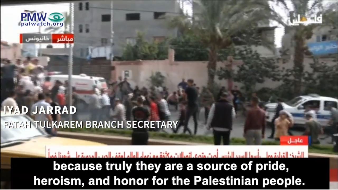 Two weeks into the war, Fatah Tulkarem Branch Secretary Iyad Jarrad referred to the massacre as Israel – the creation of the West – being “taught a lesson”: