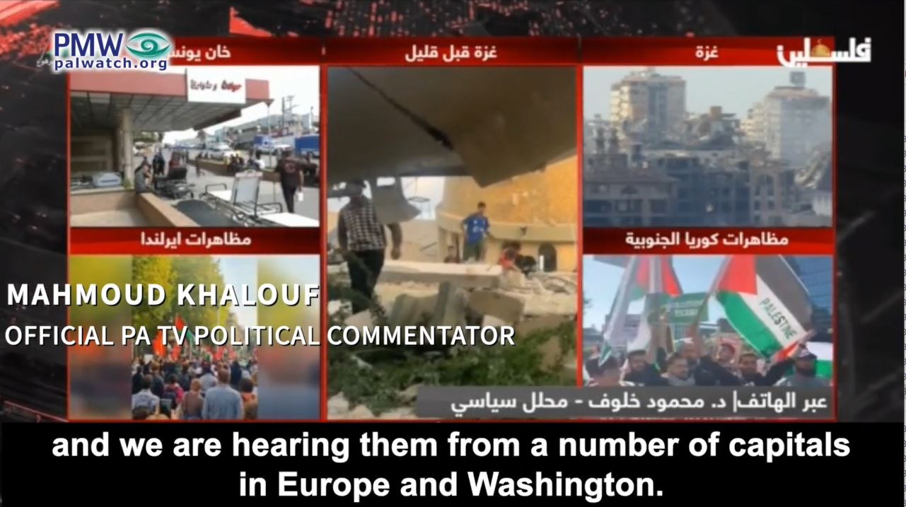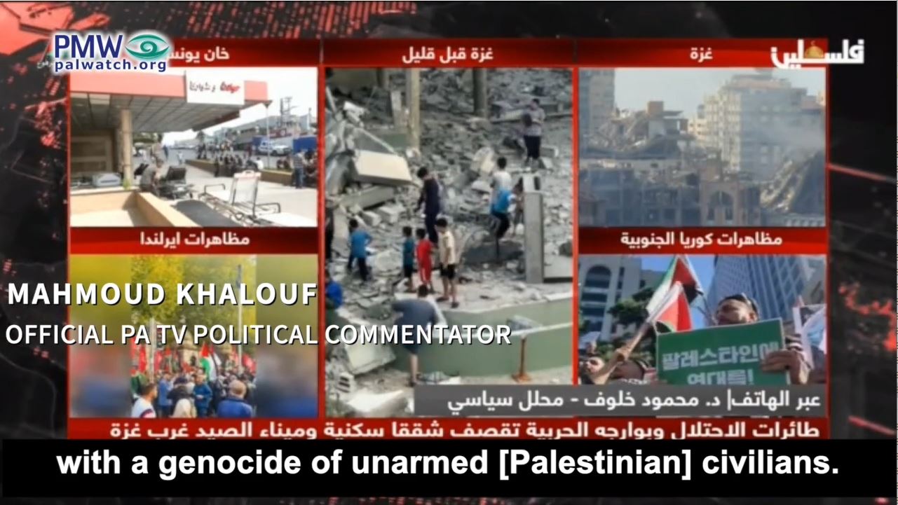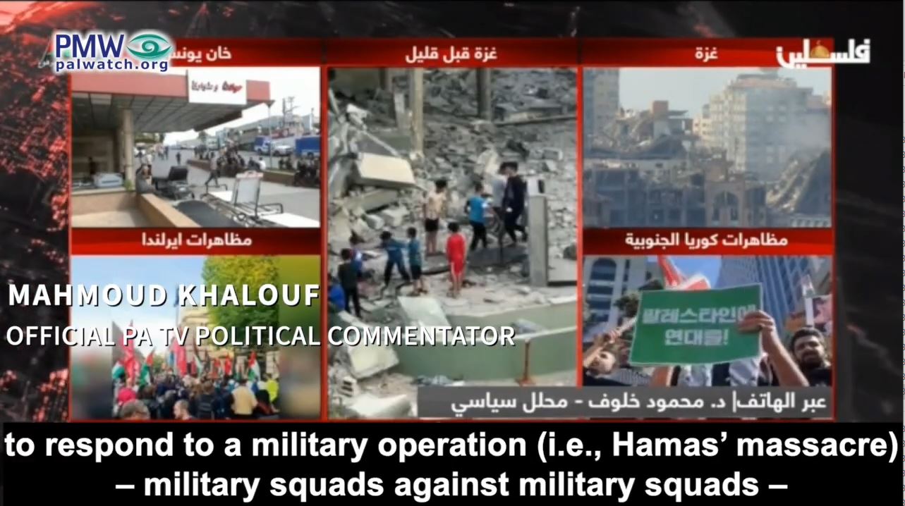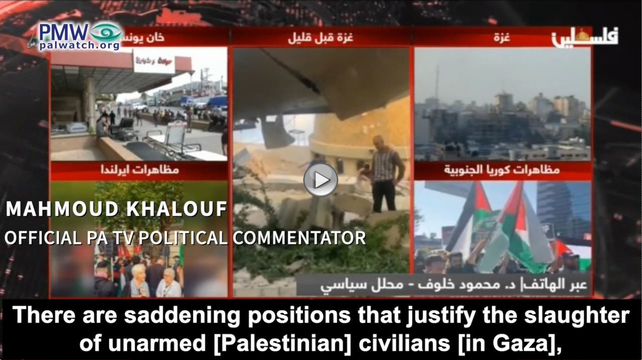 Official PA TV political commentator Mahmoud Khalouf: “There are saddening positions that justify the slaughter of unarmed [Palestinian] civilians [in Gaza], and we are hearing them from a number of capitals in Europe and Washington. It is forbidden under any circumstances to respond to a military operation (i.e., Hamas’ massacre) – military squads against military squads – with a genocide of unarmed [Palestinian] civilians. This proves the extent to which [Israeli PM] Netanyahu’s government has reached complete [moral] bankruptcy.”